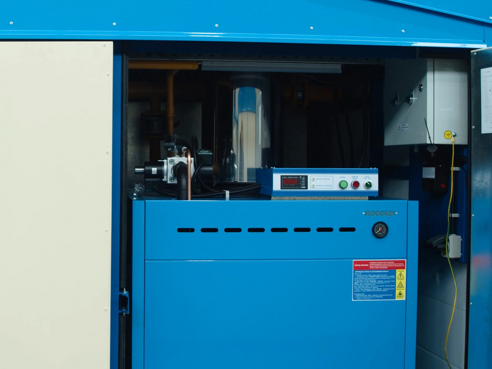 Котел RSA 80 имеет открытую топку и оборудован атмосферной горелкой. Теплообменник производится на Заводе Rossen, выполнен из оребренных труб с увеличенной поверхностью теплоотдачи.