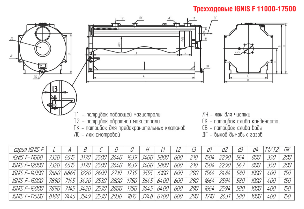 Технические характеристики водогрейного трёхходового котла ARCUS IGNIS F-12000