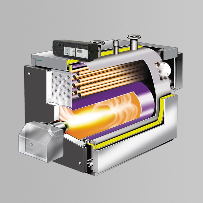 Стальной гермитичный котел с высоким КПД и рабочей температурой до 110°С. Конструкиция котла позволяет пламени развиваться вдоль продольной оси топки от фронта к тылу котла, разворачивается у выпуклого днища и возвращается вдоль стенок топки в фронту. Далее развернувшись у передней дверцы, уходящие газы направляются в дымогарные трубы, снабженные турбулизаторами и алюминиевыми вставками для увеличения поверхности нагрева и увеличения КПД до 95,25%.